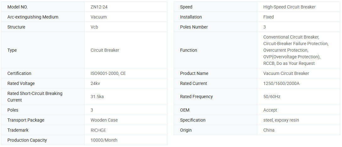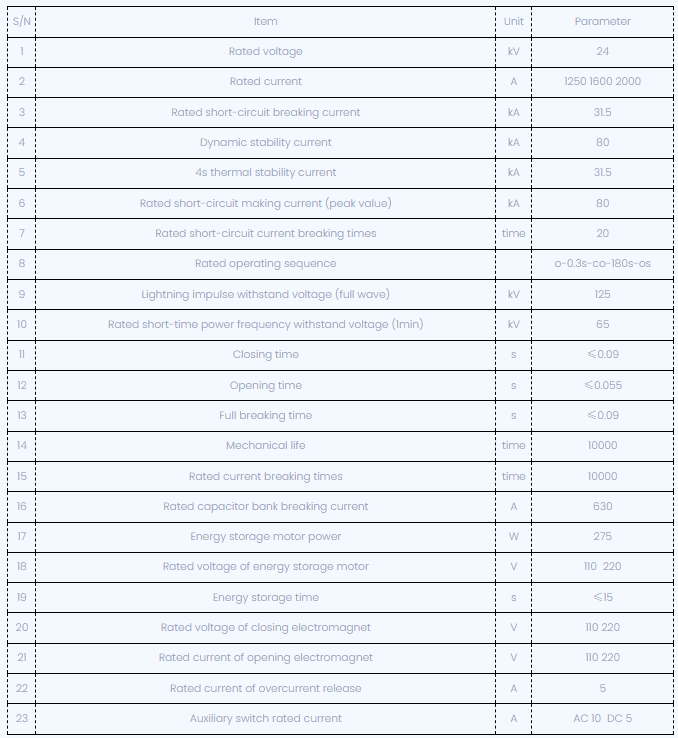 O disjuntor de vácuo Zn12-24 é um painel de alta tensão interno com uma tensão nominal de 24kV e AC 50Hz trifásico. Seu mecanismo de operação é um tipo de armazenamento de energia da mola, que pode ser operado por CA ou CC, ou manualmente. Este disjuntor é um tipo de isolamento reforçado, que atende aos requisitos do ambiente de uso nas áreas poluídas da classe II. Cargas importantes e locais de operação frequente. Este produto está em conformidade com o padrão GB1984-89 “AC de alta tensão”.
