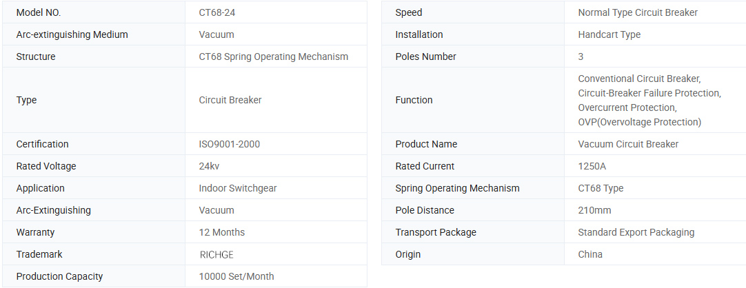 Modelo CT68 -24 Uso do disjuntor de vácuo interno com mecanismo de operação de mola CT68. É um equipamento de ditribuição de potência interna trifásica de CA, 50 Hz com a tensão de 24kV.