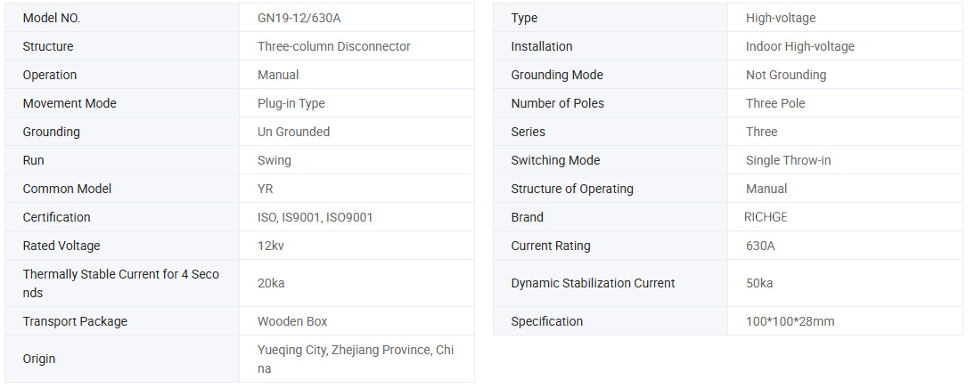 A parte condutora da chave seccionadora tipo GN19-12/400, 630, 1000, 1250 é fixada na base por dois isoladores de pilar para cada fase. (O tipo GN19-12C/400, 630, 1000, 1250 possui um isolador de pilar e um isolador de revestimento de porcelana.) As três fases são instaladas em paralelo, e a parte condutora consiste em contatos estáticos de facas de contato e suportes de contato (ou hastes condutoras). Cada fase da faca de contato é conectada ao meio do isolador de amarração, isolador de amarração e instalada na base do fuso conectado. O fuso é conectado à biela (fornecida pelo usuário) e ao mecanismo móvel do tipo CS6-1 através da alça. A faca de contato de conexão é composta por duas placas de cobre com fenda, o que não só aumenta a área de dissipação de calor da faca de contato para diminuir a temperatura inferior, mas também melhora a resistência mecânica da faca de contato, de modo que a estabilidade dinâmica da chave é melhorada. Uma extremidade da faca de contato é montada no bloco de contato (ou na haste condutora) por um parafuso (carro de Shaw). GN19-12/1000, 1250 em contato com a instalação da placa de travamento magnético, além da finalidade da placa de travamento magnético é que quando uma grande corrente de curto-circuito para aumentar a faca de contato de duas ranhuras entre o | atração. As chaves seccionadoras GN19-12/400, 630 têm um pequeno limite de corrente, portanto não há necessidade de adicionar uma placa de trava magnética.