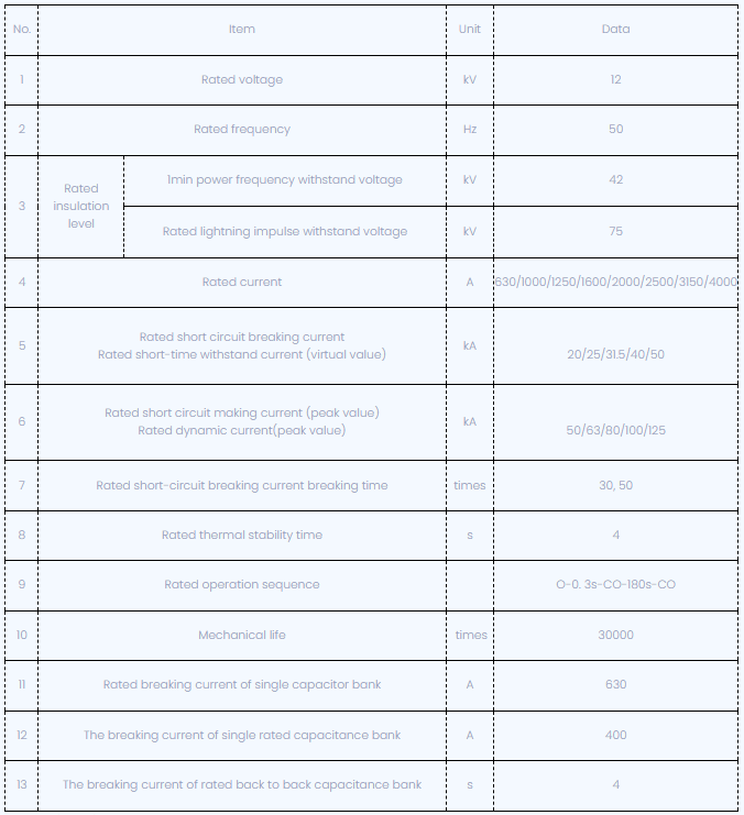 Parâmetro técnico do disjuntor de vácuo do tipo VSG-12 de mão-de-obra