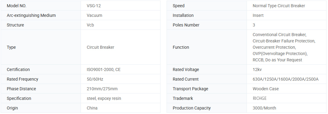 VSG-12 Tipo de alta tensão de alta tensão VSG-12 Disjuntor de vácuo usou mola para armazenamento de energia. The operating mechanism can be operated by two ways, by manual and electromotive operation, The characteristics is according with GB1984-2003 High Voltage AC Circuit Breaker, JB3855-1996 3.6-4.5KV Indoor AC High Voltage AC Circuit Breaker and IEC standard 62271-100:200162271-100:2001 High Voltage AC Circuit Breaker
