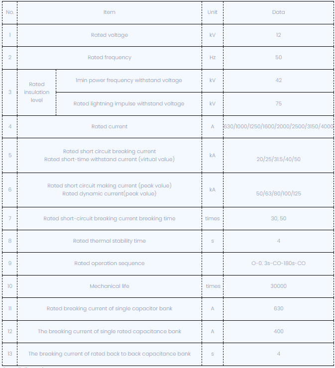 VSG-12 2000A Parâmetros técnicos do disjuntor de vácuo