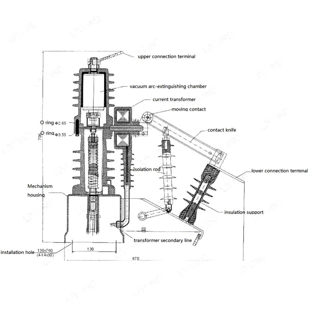 O isolamento externo do interruptor de vácuo adota a carcaça de borracha de silicone, com vida útil mais longa, maior confiabilidade, boa resistência ao clima, conveniente para transporte, boa classificação. O mecanismo operacional adota miniaturização, alto mecanismo de operação da mola confiável, tem as vantagens de estrutura simples, vida mecânica até 10000 vezes.